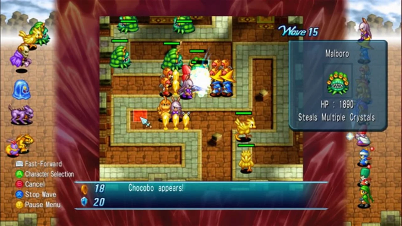 Crystal Defenders is a strategy game in which players deploy jobs from FINAL FANTASY Tactics A2 to fend off encroaching enemy hordes. Players can enjoy over 300 stages of action in one of three different game versions. W1will teach game basics. W2 introduces Power Crystals which allow for deeper, more detailed strategies. The complex maps of W3 will challenge even the most seasoned players.