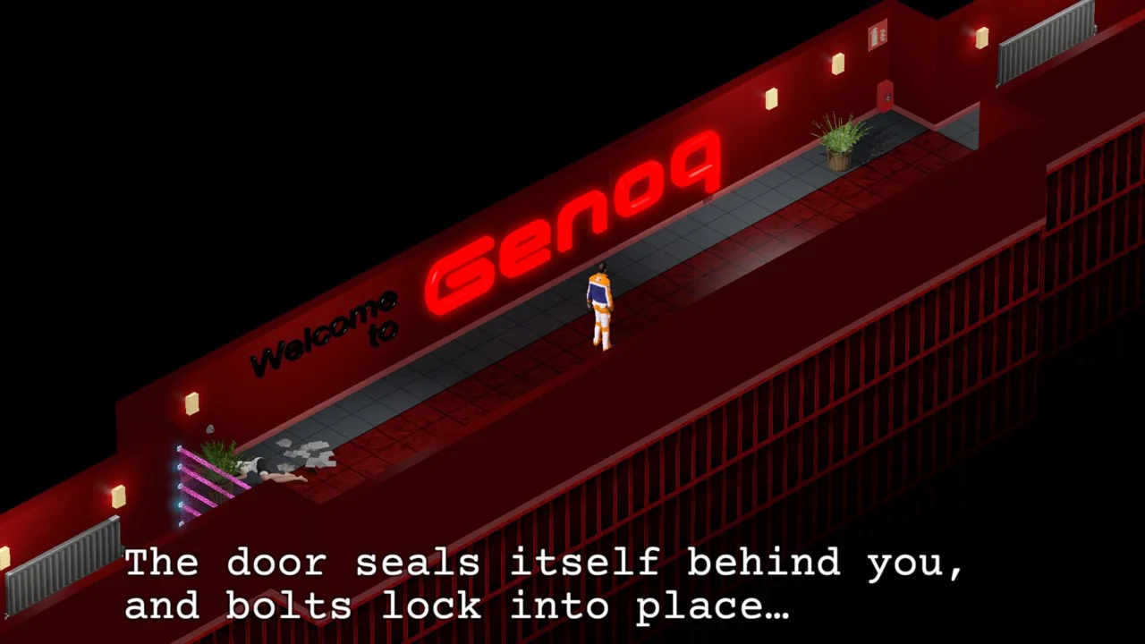 Your character is a jetpack courier that has to deliver an important package to Genoq’s leading researcher, Derrida, and is oblivious to the danger until the doors lock behind him.