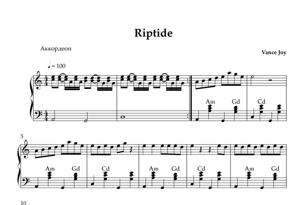 "Riptide" Vance Joy (ноты для аккордеона)